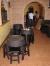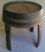 Barrica mesa con patas de duelas, atornillados los aros y barnizada en nogal envejecido.