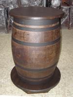 Barrica 225 L atornillados los aros, con tapa de pino de 70 cm, reposapiés y barnizada en nogal envejecido.
