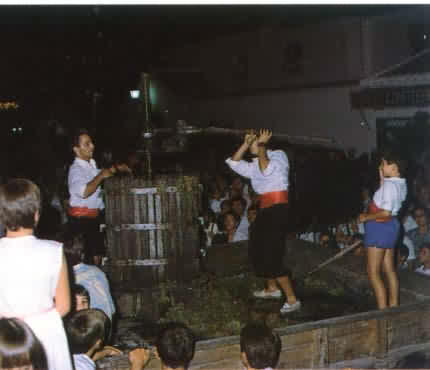 Once the grape is ripe, it is daintily transported from the vineyards to the presses, where the clusters are ground by modern procedures, separating from the must the so-called 'yolk' (the first must obtained just before the grapes get pressed), which is destined to the production of the finest wines. In the photographs, ancient and modern processes to press the grapes.