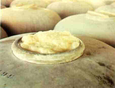 In the photographs, typical flower veil of yeast formed at the surface of wine which is characteristic of the biological rearing of finos and amontillados. The boot with a crystal lid allows the observation of the process, the aspects of which are shown here. |